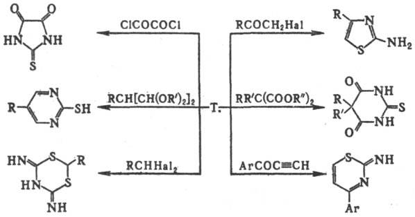 Р-ции тиомочевины с бифункцион. соединениями используют для синтеза разл. гетероциклич. систем, напр.: