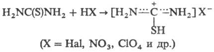 В хим. р-циях тиомочевины в качестве нуклеоф. центра выступает атом S, а не атом N (как в мочевине). Тиомочевина образует соли с галогенами, минер. и орг. к-тами, а также нек-рыми основаниями, напр.: