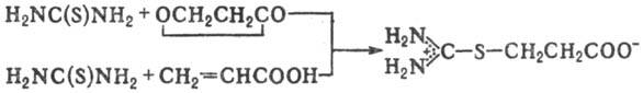 Аналогично тиомочевина взаимод. в присут. НС1 с нек-рыми спиртами (напр., с бензиловым, фурфуриловым). S-Алкилпроиз-водные образуются также при действии на тиомочевину b-лактонов или a,b-ненасыщ. к-т, напр.: