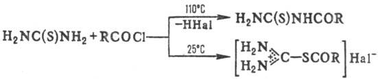 Взаимодействие тиомочевины с ацилгалогенидами или ангидридами карбоновых к-т в зависимости от т-ры р-ции приводит к N- или S-ацилпроизводным: