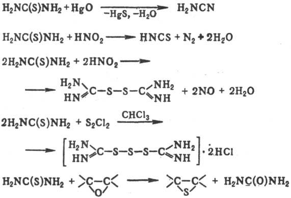 металлов в присут. к-т в зависимости от рН среды образует тиоциановую к-ту или формамидиндисульфид, при обработке S2Cl2 в СНСl3 дает дигидрохлорид формамидинтри-сульфида; с эпоксидами образует тиираны: