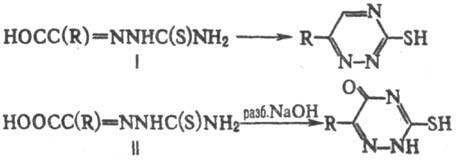 Тиосемикарбазоны арил(гетерил)замещенных a-дикарбоншгьных соед., напр, ф-л I и II, циклизуются с образованием соотв. 1,2,4-триазинов и триазинонов, напр.: