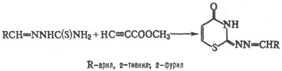 Конденсация тиосемикарбазонов нек-рых ароматич. альдегидов с метиловым эфиром пропиоловой к-ты приводит к тиазинонам, напр.: