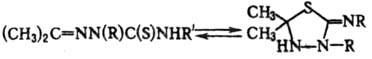(R-H, одинаковые или разл. алкил, арил, гетарил), продукты взаимод. тиосемикарбазидов с карбонильными соединениями. Тиосемикарбазоны-хорошо кристаллизующиеся стабильные в-ва, плохо раств. в воде и орг. р-ритслях.