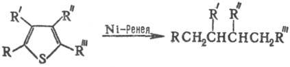 При действии скелетного Ni с участием адсорбированного Н2 идет восстановит. десульфуризация замещенных тиофенов с образованием алифатич. соединений: