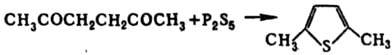 Тиофен и его гомологи содержатся в продуктах коксования каменного угля (откуда их и выделяют вместе с кам.-уг. бензолом) и продуктах термич. разложения сланцев (в нек-рых фракциях до 70% по массе). В сыром бензоле содержание тиофена составляет 1,3-1,4%, в получаемом из сырого бензола тиофено-бензольном концентрате-30-35%. Осн. сырье для синтеза тиофена и его гомологов-углеводороды нефтяных фракций С4 и С5, из к-рых они м.б. получены термич. взаимод. с S или каталитич. р-цией с H2S или SO2. Тиофен синтезируют также пропусканием фурана, ацетилена или 1,3-бутадиена и H2S над Аl2О3. Гомологи тиофена, а также нек-рые производные получают замыканием соответствующих 1,4-дикарбонильных соед. с помощью P2S5, напр.: