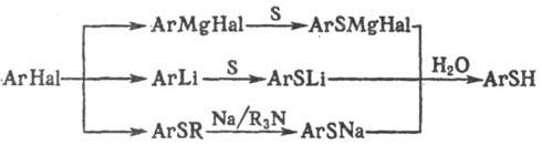 Получают тиофенолы обычно косвенными методами с использованием металлоорг. соединений., напр.: