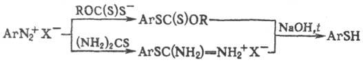 2) с образованием ArSxAr либо с (CuSCN)2 с образованием ArSCN с послед, восстановлением Zn в СН3СООН, NaBH4 или LiAlH4.