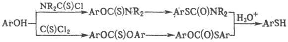 Тиофенолы могут быть получены из фенолов; последние переводят в О-арилтиокарбаматы либо эфиры тиолкарбоновых к-т и далее подвергают термич. перегруппировке (см. Ньюмена-Кворта реакция) и гидролизу, напр.: