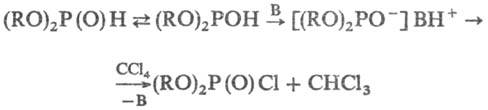 Механизм р-ции полностью не выяснен. Установлено, что на первой стадии образуется хлорангидрид соответствующего эфира фосфористой к-ты (В-основание):
