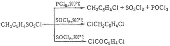 При термолизе толуолсульфохлоридов, особенно в присут. хлорирующих агентов, происходит элиминирование сульфогруппы: