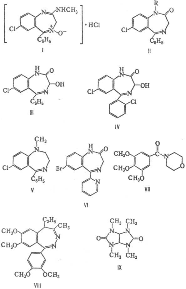 Наиб. распространены производные 1,4-бензодиазепина-высокоэффективные и малотоксичные препараты. К ним относятся: 1) хлордиазепоксид (гидрохлорид 2-метиламино-5-фенил-7-хлор-3H-1,4-бензодиазепин-4-оксида, хлозепид, элениум, напотон, радепур, либриум и др., ф-ла 1)-бесцв. кристаллы, т. пл. 212-218 °С, плохо раств. в воде, раств. в этаноле и хлороформе. Получают в неск. стадий: действием гидроксиламина на 2-бензоил-4-хлоранилин образуется соответствующий оксим, аминогруппу к-рого ацетилируют хлорангидридом хлоруксусной к-ты; образующееся в-во под действием к-т Льюиса дает 4-фенил-7-хлор-2-хлорметил-хиназолин-3-оксид; в присут. метиламина пиримидиновое кольцо последнего переходит в 1,4-диазепиновое. 2) Диазе-пам [1-метил-5-фенил-7-хлор-2,3-дигидро-1,4-бензодиазе-пин-2(1H)-он„ сибазон, седуксен, реланиум, валиум и др.; II, R = СН3]-бесцв. кристаллы, т. пл. 130-134°С, не раств. в воде, плохо раств. в этаноле и хлороформе. Получают обычно из 2-бензоил-4-хлоранилина действием хлорангид-рида хлор- или бромуксусной к-ты, а затем аммиака; продукт при нагр. дает десметилдиазепам (II, R = Н; также используется как транквилизатор), к-рый метилируют метилгалогенидом. 3) Оксазепам [3-гидрокси-5-фенил-7-хлор-2,3-дигидро-1,4-бензодиазепин-2(1H)-он, тазепам, нозепам, серакс и др., III]-бесцв. кристаллы, не раств. в воде. Получают из 4-фенил-7-хлор-2-хлорметилхиназолин-3-оксида, к-рый под действием NaOH перегруппировывается в 7-хлор-5-фенил-1,4-бензодиазепинон-4-оксид; последний в присут. ацетан-гидрида при нагр. превращается в ацетилированный по гидроксигруппе оксазепам, к-рый выделяют последующим кислотным или щелочным гидролизом. 4) Лоразепам [3-гидрокси-7-хлор-5-(2-хлорфенил)-2,3-дигидро-1,4-бензо-диазепин-2(1H)-он, тавор, ативан и др., IV]-бесцв. кристаллы, не раств. в воде. Получают из 4-(2-хлорфенил)-7-хлор-2-хлорметилхиназолин-3-оксида так же, как оксазепам. 5) Медазепам [1-метил-5-фенил-7-хлор-2,3-дигидро-1H-1,4-бензодиазепин, мезапам, нобриум, рудотель и др., V]-бесцв. кристаллы, не раств. в воде, хорошо раств. в этаноле. Получают из 4-хлор-N-метиланилина действием этилен-имина и бензоилхлорида (или N-бензоилэтиленимина), а затем Р2О5 и РОСl3.