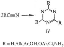 Общий способ получения 1,3,5-триазина и его наиб. важных 2,4,6-производных -циануровой кислоты (IV; R = ОН), циа-нурхлорида, меламина (IV; R = NH2) и др. - циклотримери-зация соед., содержащих группу Cs=N, гл. обр. нитрилов: