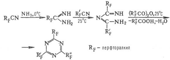 Несимметрично замещенные производные 1,3,5-триазина, к-рые не м. б. получены методами тримеризации, синтезируют из соответствующих нециклич. соед. (бигуанидов, цианамиди-нов, изоцианатов и др.). Нек-рые фторорг. производные получаютпо схеме: