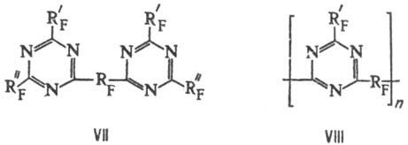 Используя в подобных р-циях вместо нитрилов динитри-лы, синтезируют производные ф-лы VII, а также полимеры ф-лы VIII, отличающиеся высокой термич. и хим. стабильностью: