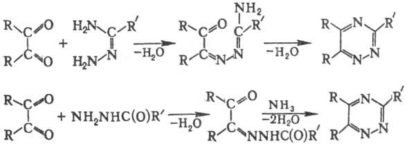 Осн. способы получения 1,2,4-триазина и его производных-конденсация a-дикетонов с амидразонами, семикарбазида-ми, тиосемикарбазидами, аминогуанидинами или гидрази-дами к-т (при замыкании цикла аммиаком), напр.: