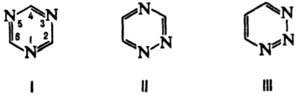 Лит.: Общая органическая химия, пер. с англ., т. 8, М., 1985, с. 185-94; Мельников Н. Н., Пестициды. Химия, технология и применение, М., 1987, с. 639-61; Neunhoeffer H., WileyP.F., Chemistry of 1,2,3-triazines and 1,2,4-tria-zines, tetrazines and pentazines, N. Y., 1978; Comprehensive heterocyclic chemistry, ed. by A. Katritzky, Ch.W. Ress, v. 3, pt 2B, Oxf., 1984, p. 369-530; Hearn M.J., Levy F., "Organic preparations and procedures int.", 1984, v. 16, № 3-4, p. 199-277. Г.С. Швиндлерман.