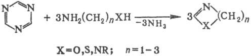 Аналогично при р-ции 1,3,5-триазина с о-фенилендиамином получается бензимидазол, с 4,5-диаминопиримидином-пурин, с 4,5-диаминоурацилом-ксантин и т.п.; при действии N2H4·HCl 1,3,5-триазин превращается в 1,2,4-триазол. С имино-эфирами или амидинами образует алкил(арил)производные 1,3,5-триазина: