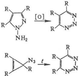 1,2,3-Триазин и его производные. Незамещенный 1,2,3-триазин -бесцв. кристаллы, т.пл. 69,5-71 °С, возгоняется в вакууме. 1,2,3-Триазин и его производные при комнатной т-ре устойчивы к воде, к-там и основаниям. При нагр. гидролизуются до 1,3-дике-тонов; надкислотами окисляются в 1(или 3)-N-оксиды; LiAlH4 восстанавливает их в дигидропроизводные. Три-алкилзамещенные 1,2,3-триазина при термолизе и фотолизе чаще всего расщепляются с образованием N2, алкина и нитрила. Получают 1,2,3-триазин и его производные окислением N-ами-нопиразолов пероксидами или термич. перегруппировкой циклопропенилазидов в мягких условиях: