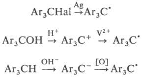 Получают триарилметильные радикалы восстановлением триарилметилгалоге-нидов (или перхлоратов), восстановлением триарилме-тилкарбкатионов и окислением триарилметилкарбанио-нов, напр.: