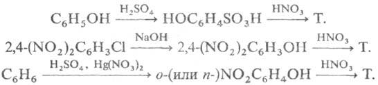 Пром. методы синтеза тринитрофенола: сульфирование фенола с послед. нитрованием образующейся n-фенолсульфокислоты; омыление 2,4-динитрохлорбензола в 2,4-динитрофенол с послед. нитрованием; окислит. нитрование бензола в присут. ртутных катализаторов: