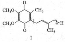 УБИХИНОНЫ (коферменты Q; Qn, KoQn, 2,3-диме-токси-5-метил-6-полипренилбензохиноны, ф-ла I), желтые или желто-оранжевые кристаллы (при n = 7-15) или красные маслообразные в-ва (n=1-6), не раств. в воде, раств. в орг. р-рителях: