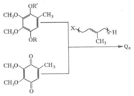 Существуют два осн. пути хим. синтеза убихинонов. Один из них включает алкилирование полипренильной цепью 2,3-диме-токси-5-метил-1,4-гидрохинона либо его моно- [R(R') = H, R'(R) = AIk, Ac] или диэфиров (R= R'= AIk, Ac) по р-ции Фриделя - Крафтса, а также регио- и стереоселективное пренилирование бензохинонового ядра: