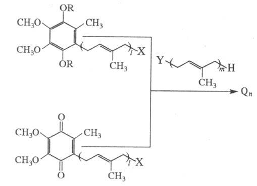 Второй подход к хим. синтезу убихинонов состоит в наращивании по терминальному звену полипренильной цепи низшего прир. гомолога или синтетического убихинона в окисленной форме либо в виде диэфира QnH2 на недостающий пренильныи фрагмент с помощью разл. р-ций С - С-сочетания: