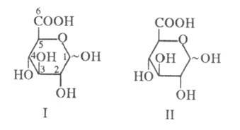 УРОНОВЫЕ КИСЛОТЫ, моносахариды (альдозы), молекулы к-рых вместо первичной спиртовой группы содержат карбоксильную. Назв. уроновых кислот производят от назв. соответствующих альдоз путем прибавления к корню окончания "уроновая к-та" [напр., D-глюкуроновая к-та (ф-ла I), D-галактуроновая к-та(II)].