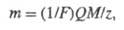 где M - мол. м. в-ва, участвующего в электролизе, z - число элементарных зарядов, соответствующее превращению одной молекулы этого в-ва, 1/F- коэф. пропорциональности, общий для всех в-в, F - Фарадея постоянная, равная 96484,56 Кл/моль.
