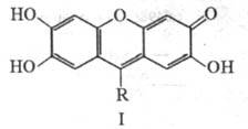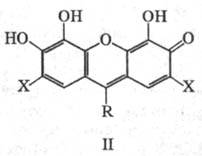 К тригидроксифлуоронам относят также соед. общей ф-лы II, обладающие аналогичными св-вами. Важнейшие представители: галлеин (II, X = H, R - 2-карбоксифенил), пирогалловый красный (П, X = H, R- 2-сульфофенил) и бромпирогалловый красный (II, X = Br, R - 2-сульфофенил). Они применяются в качестве комплексонометрич. индикаторов и для фотометрич. определения Ag(I), РЗЭ, Zr(IV), Sn(IV), Mo(VI) и др. .