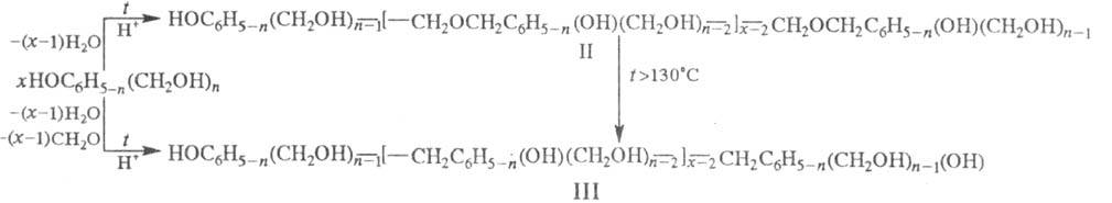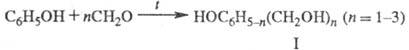 1) с образованием реакцион-носпособных (термореактивных) метилолфенолов (ф-ла I) и(или) олигомерных метилольных производных ф-л II и III; 2) при недостатке CH2O (п < 1) образуются аналогичные производные, не содержащие метилольные группы и не способные к дальнейшим р-циям поликонденсации без введения дополнит, кол-ва CH2O или др. реакционноспособ-ных в-в.