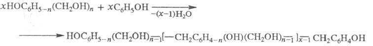 В зависимости от числа активных атомов водорода в фенольном ядре, молярных соотношений исходных реагентов, скорости и глубины прохождения р-ций могут образовываться многообразные промежут. и конечные продукты, различающиеся хим. составом и степенью полимеризации х - от мономерных метилолфенолов (х = 1) до густосетчатых полиметилен- или полидиметиленоксидфенолов