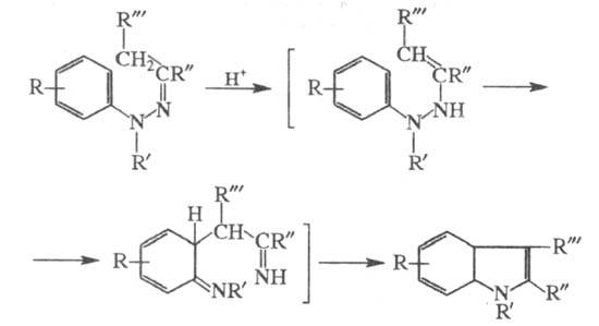 Считается общепринятым, что ключевой стадией процесса является кислотно-катализируемая перегруппировка енгидра-зинной формы арилгидразона по схеме 3,3-сигматропного сдвига (т. наз. 3,4-диазаперегруппировка Коупа; см. также Коупа перегруппировка)с последующей ароматизацией 6-членного и замыканием пиррольного циклов.