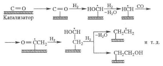 В присут. Ce, Cr, Mn, Mo и нек-рых др. металлов, а также их оксидов при высоких давлениях и т-рах (ок. 15 МПа, 400-450 0C) из СО и H2 образуются гл. обр. кислородсодержащие соед. (ок. 10% к-т, остальное - спирты, альдегиды, кетоны).