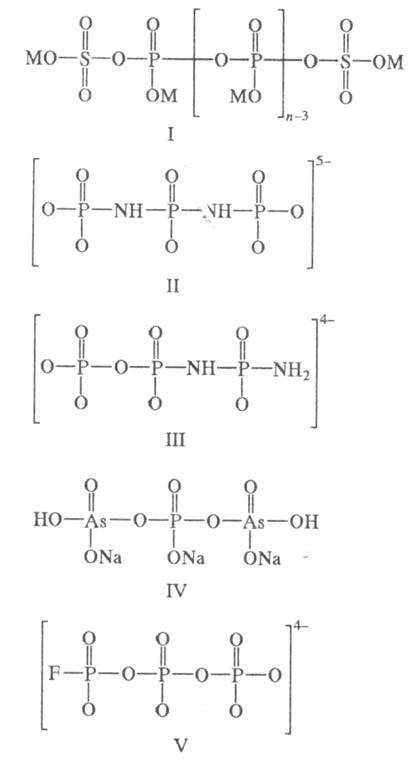 Неорганические производные фосфатов неорганических. Замещением в конденсированных фосфатах неорганических концевых атомов О атомами S получают тиофосфаты, напр. монотиотрицикло-фосфат Na3P3O8S· 6H2O, тетратиотетрациклофосфаты MII2P4O8S4· 10H2O, где M = Sr, Ba, а присоединением групп SO3 к концам цепи - сульфатофосфаты ф-лы I, где M = Na, n — 3-25. При замене мостиковых и концевых атомов О ионов P3O5-10 соотв. амидо- и имидогруппами образуются ионы дии-мидо-(П) и амидоимидотрифосфаты (Ш). Известны силика-то-, хромато-, ванадато- и арсенатофосфаты типа Na3H2(P, As)3O10 (IV) и др. Фторотрифосфат-ион (V) благодаря смещению положит, заряда рециклизуется при рН > 7 с образованием трициклофосфат-иона.