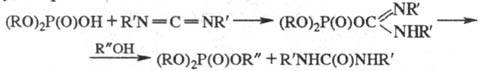 3. Фосфорилирование. С помощью фосфорорганических соединений, в молекулах к-рых атом P связан с электроноакцепторной (уходящей) группой, можно вводить фосфорный остаток в состав нукле-офилов (осуществлять (расформирование). В качестве уходящих групп обычно выступают галогениды, алкокси-, тиоал-коксигруппы и др., напр.: