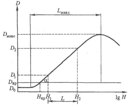 Рис. 1. Характеристическая кривая зависимости оптической плотности от экспозиции (пояснение в тексте).