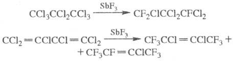 В качестве агента фторирования в р-циях обмена галогена на фтор, а также в р-циях окислит. Фторирование кратных связей в полигалогенир. алкенах используют SbF3 (реакция Свартса). Иод и бром обмениваются легче, чем хлор. В случае полигалогенпроиз-водных полное перегалогенирование невозможно, т.к. по мере увеличения числа атомов F в молекуле дальнейшее фторирование затруднено из-за стерич. факторов, напр.: