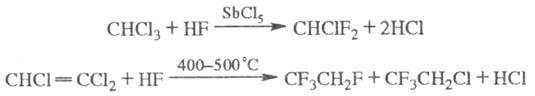 Часто для заместительного фторирования используют газообразный безводный HF в присут. галогенидов Sb, Sn и др. при 70-150 0C и 0,6-2,5 МПа либо в присут. катализатора (AlF3, CrF3 и др.) при нагревании, напр.: