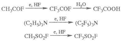 В пром. орг. синтезе широко применяют электрохим. фторирование. Процесс осуществляют в электролитич. ванне, содержащей безводный HF, на Ni-аноде при 5-6 В (р-ция Саймонса). Метод наиб, удобен для фторирования низкомол. соед. вследствие меньшей деструкции фгорир. молекулы, а также для фторирования соед., содержащих функциональные группы (амины, карбо-новые к-ты и др.), напр.: