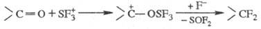 Соед., содержащие карбонильную группу, фторируются SF4 в присут. HF, BF3; р-ция происходит через промежут. образование реакционноспособного иона SF+3, напр.: