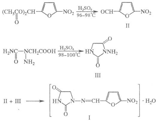 ФУРАДОНИН [гидрат 1-(5-нитрофурфурилиденамино)ги-дантоина; ф-ла I], мол. м. 256,18; желтые или оранжево-желтые кристаллы горького вкуса, т. пл. 258-263 0C (с разл.); практически не раств. в воде и этаноле, плохо раств. в ацетоне. При хранении на свету разлагается с изменением цвета. При получении фурадонина сначала синтезируют 5-нитрофурфурол (II) и 1-аминогидантоин (III). Неустойчивые соед. II и III (без выделения из реакц. смеси) конденсируются при 80 0C: