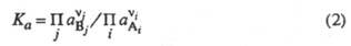 В состоянии химического равновесия система характеризуется константой равновесия Ка , выражающей для р-ций в р-рах соотношение между активностями аАi исходных реагентов и активностями аBj продуктов: