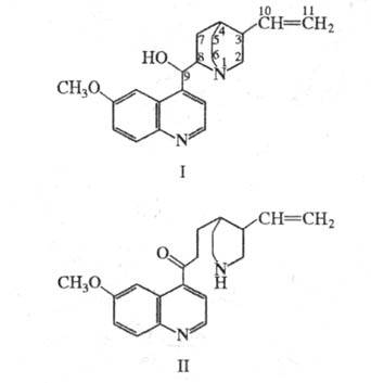 Хинин (ф-ла I) - бесцв. кристаллы горького вкуса, мол. м. 324,4, т. пл. 177 °С,