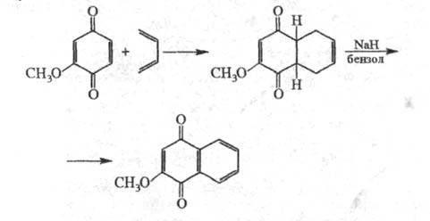 Хиноны легко вступают в диеновый синтез, причем 1,2-хиноны могут выступать как диены и диенофилы, а 1,4-хиноны- как диенофилы, напр.: