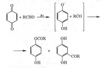 Облучение хинонов УФ светом в присут. альдегидов приводит к продуктам С- и О-ацилирования, напр.: