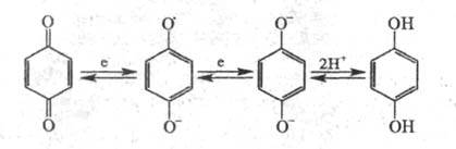 Хиноны весьма склонны к переходу в ароматич. соед.; присоединение одного электрона приводит к образованию сёмихиненового анион-радикала, к-рый при присоединении еще одного электрона дает дианион, в кислой среде превращающийся в двухатомный фенол, напр. в случае 1,4-бензохинона: