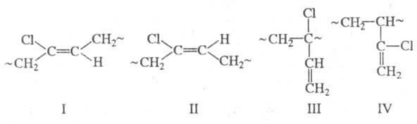 ХЛОРОПРЕНОВЫЕ КАУЧУКИ (полихлоропрены, наириты, неопрены, байпрены, бутахлоры, скайпрены), продукты гомо- и сополимеризации хлоропрена. Выпускают гл. обр. высокомол. гомополимеры хлоропрена и его сополимеры с 3-10% дихлорбутадиена.Структура и свойства каучуков. Звенья хлоропрена в макромолекуле хлоропреновых каучуков имеют конфигурации 1,4-транс (ф-ла I, 88-92%), 1,4-цис (II, 7-12%), 1,2 (III, 4,5%) и 3,4 (IV, 1%).