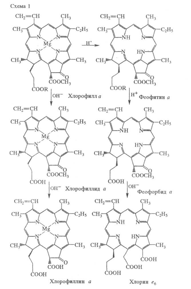 Под действием к-т и оснований хлорофиллы легко подвергаются структурным изменениям. Так, обработка слабыми р-рами к-т приводит к удалению центрального иона Mg с образованием феофитинов. Конц. НС1 наряду с Mg отщепляет фитол с образованием феофорбидов; раскрытие циклопентанонового кольца под действием конц. щелочи приводит к хлоринам. При обработке слабыми щелочами хлорофиллы постепенно теряют сложноэфирные группы, сохраняя центральный ион металла; при этом образуются хлорофиллиды и хлорофиллины. Аналогичные превращения претерпевают также и бактериохлорофиллы.